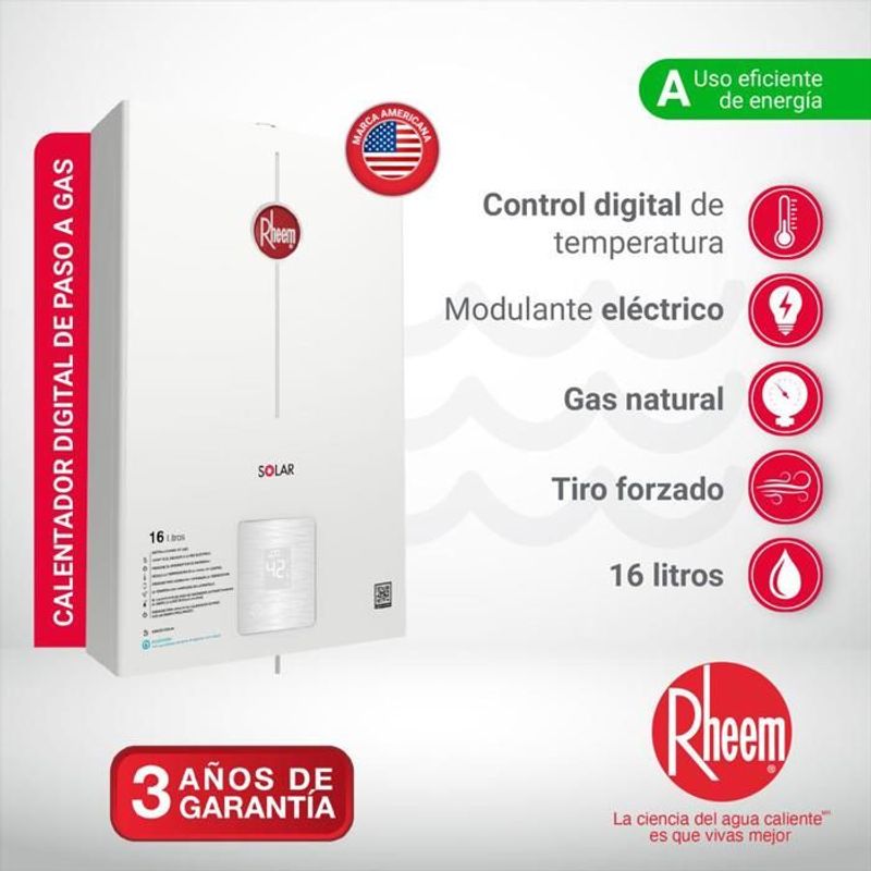 Calentador De Agua 16Lt Gas Natural Tiro Forzado Digital Rheem